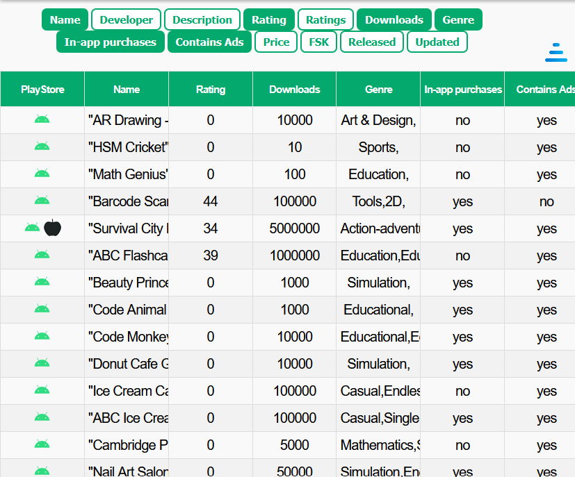 Browse a large database with over one hundred thousand apps for Android and iOS. Use a comprehensive filtering system to find the apps you are searching for. Whether in‑app purchases, advertising, low ratings, genres, or specific keywords – everything can be filtered. The database is regularly updated.